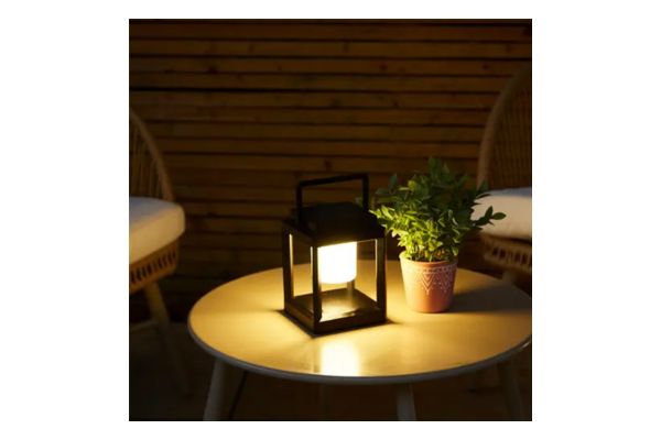 - Sleek, contemporary solar-powered portable lantern perfect for outdoor spaces