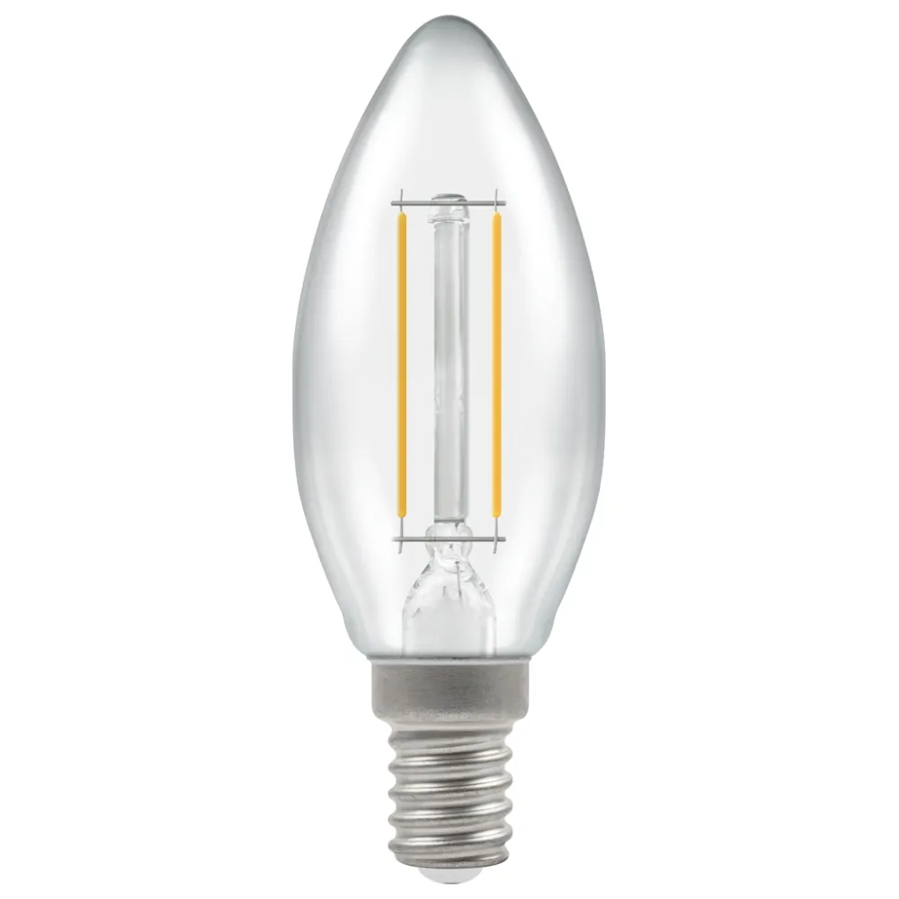Dimmable LED filament 35mm candle lamp with clear finish.